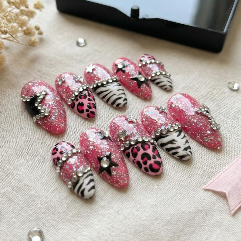 2K Pink Leopard Press On Nails: Glitter Star Rhinestone Nail Set
