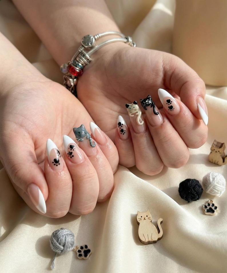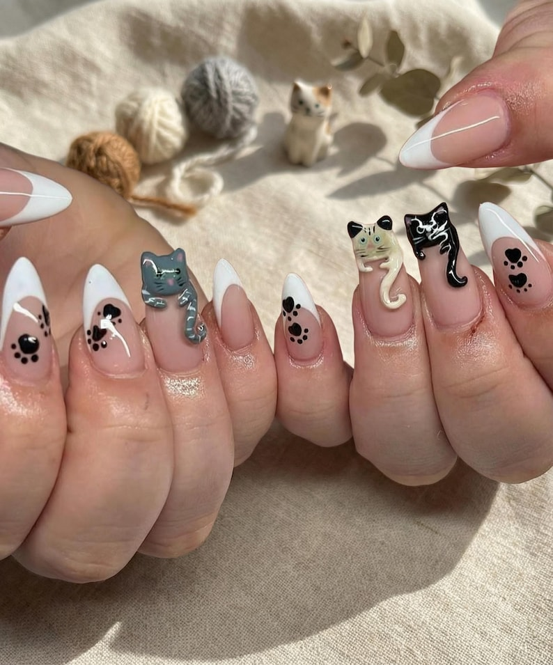 3D Hugging Cat Press On Nails: Cute French Tip Cat Paw Print Handmade Nail Set