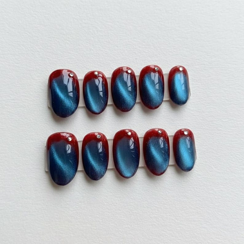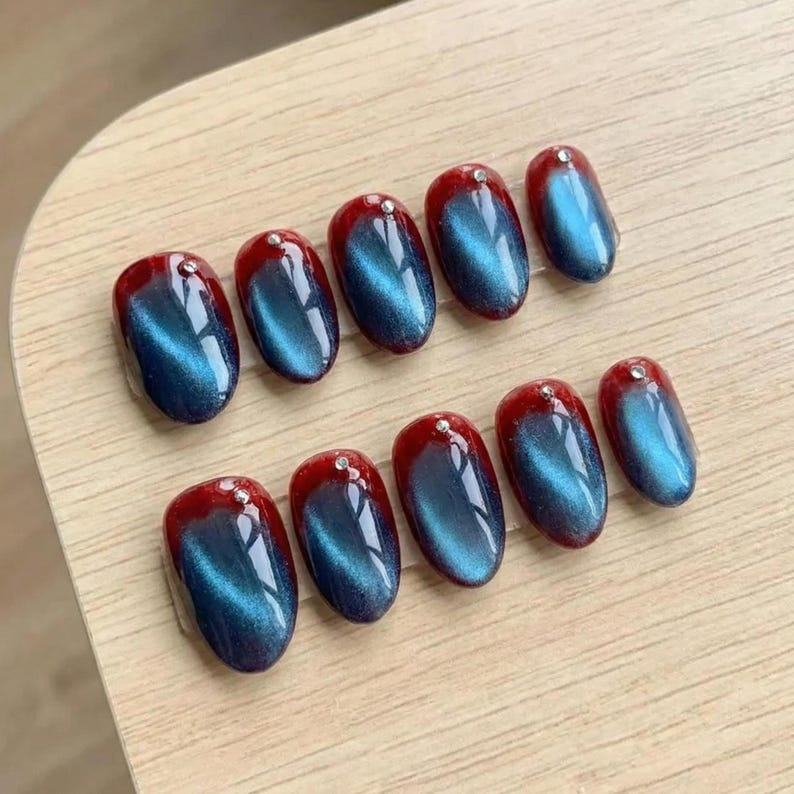 Red and Blue Cat Eye Press On Nails: Y2K Chrome Gel, Hand Painted