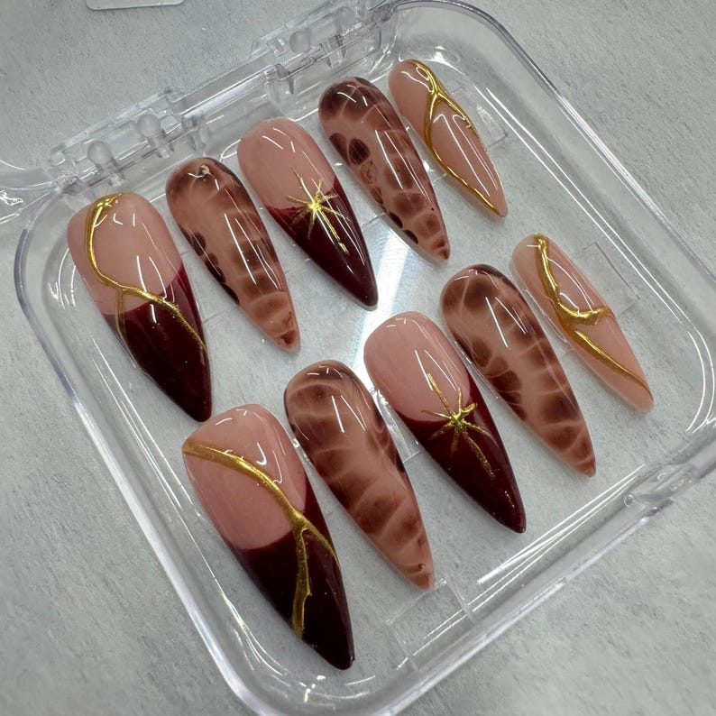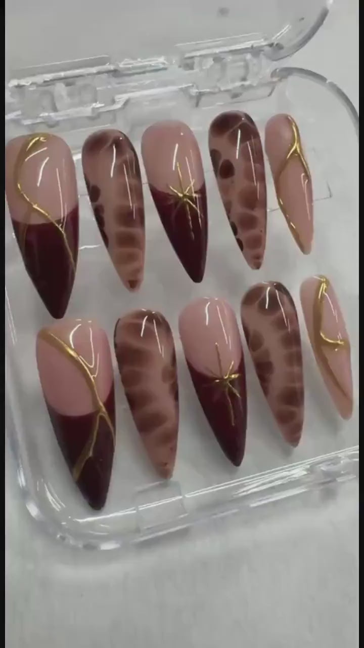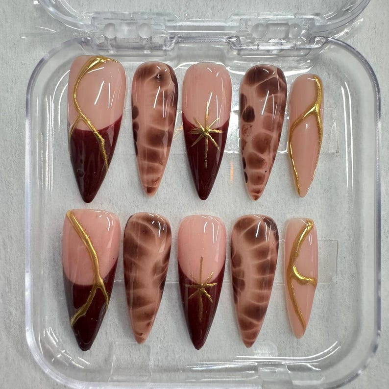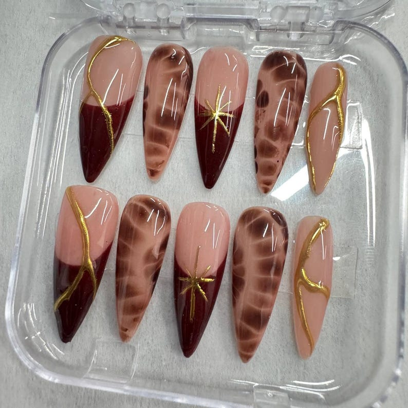 Brown Marble & Gold Line Press On Nails: Elegant Fall Nail Art Set