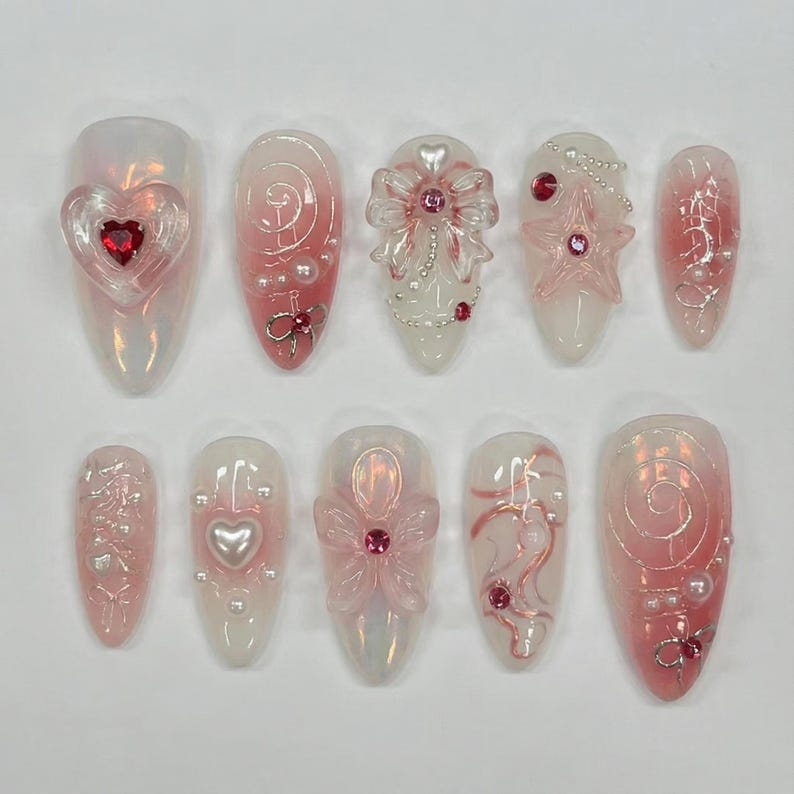 Luxury 3D Coquette Press On Nails | Pink Pearl Heart & Bow Ethereal Nail Set