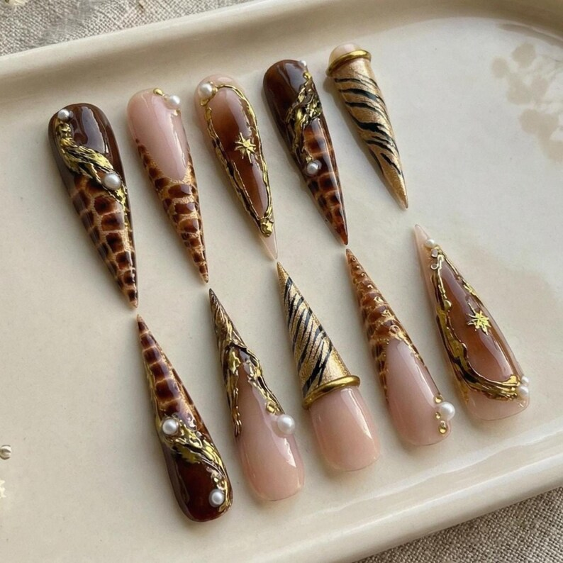 Luxury Giraffe Zebra Print Press On Nails: 3D Gold Liquid Metal Pearl Reusable Set