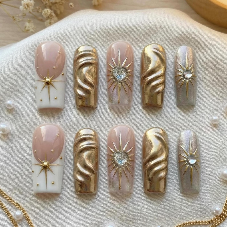 Gold Celestial Sun Press On Nails: 3D Heart Star Gilded Luxury Gift for Her