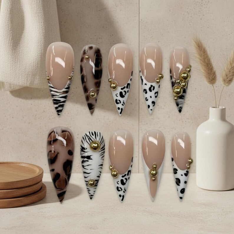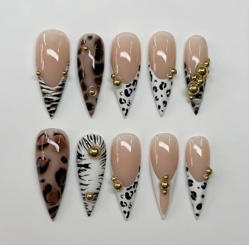 Handmade Safari Stiletto Press On Nails: Gold Bead Animal Print