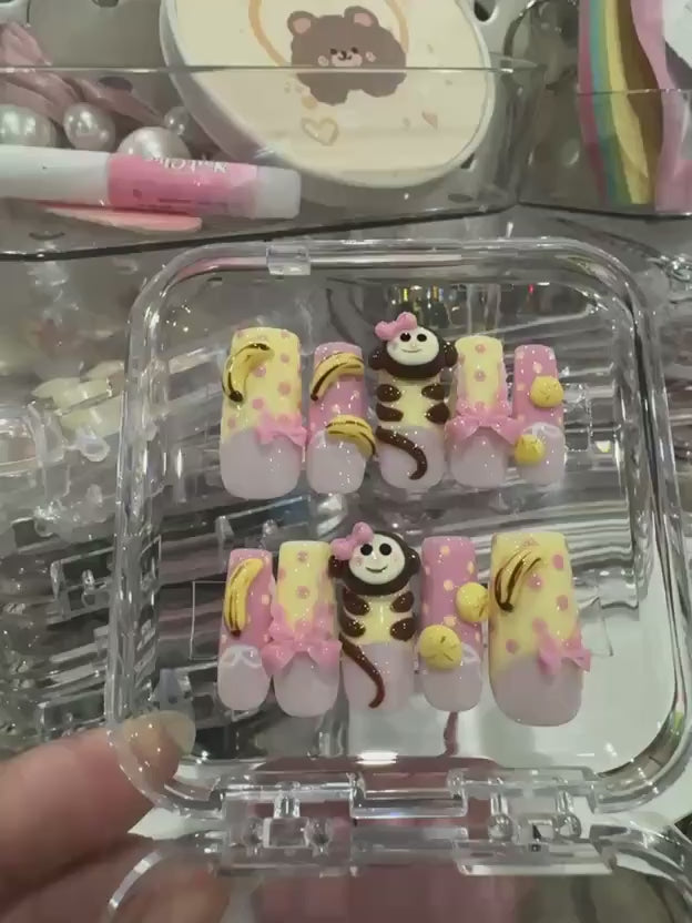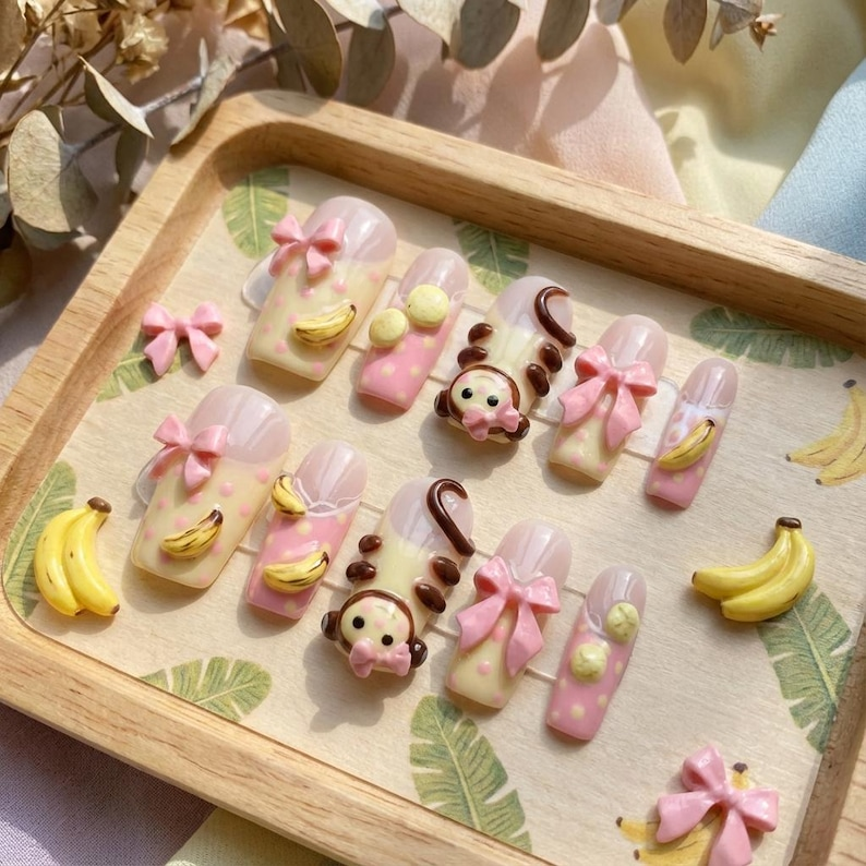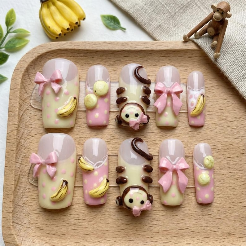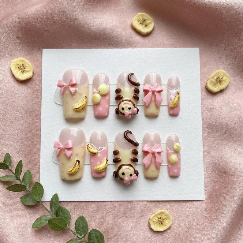 Kawaii 3D Monkey Press On Nails: Pastel Banana Bow Polka Nail Art