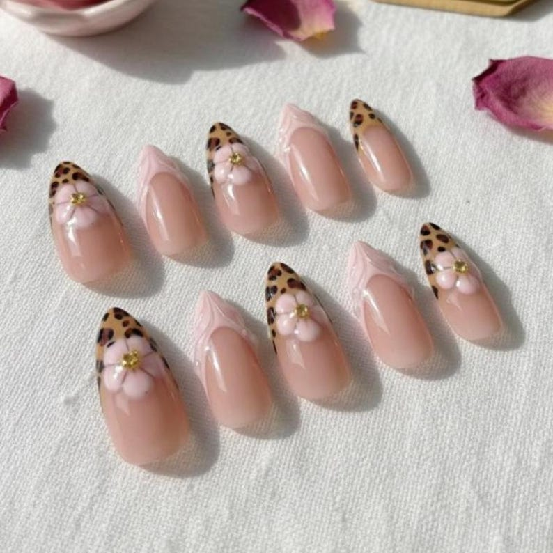 Leopard Print Press On Nails: 3D Pink Floral French Tip Romantic Gift for Her