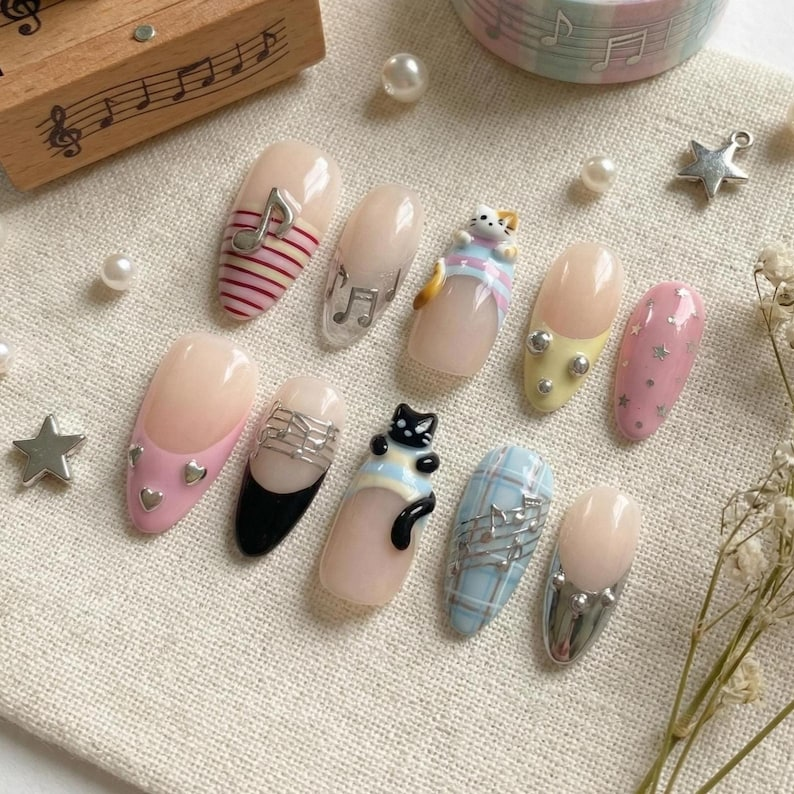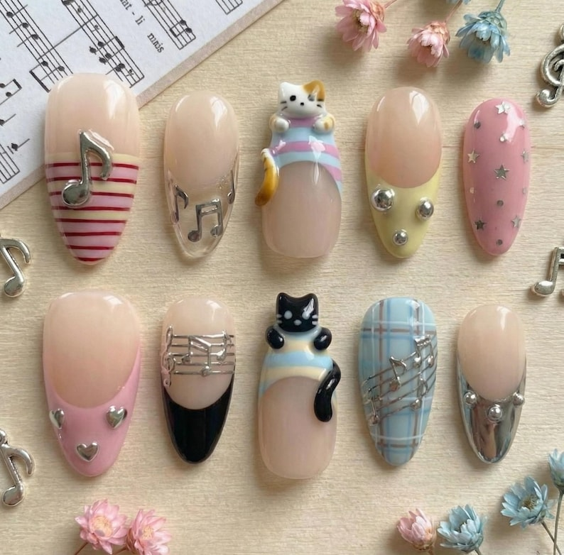 Luxury 3D Melody Cat Press On Nails: Pastel French Tip & Silver Note Nail Set