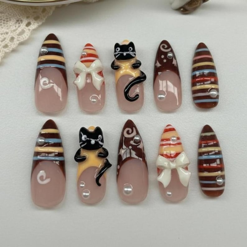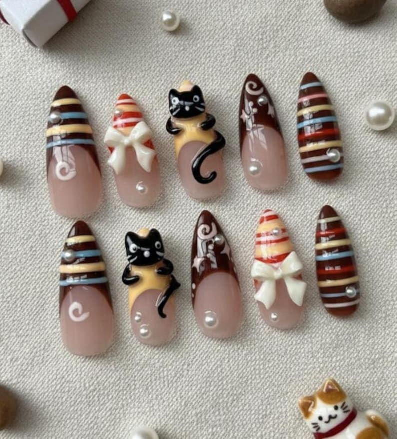 Luxury Brown Cat Press On Nails: 3D Bow Pearl Reusable Almond Nail Set