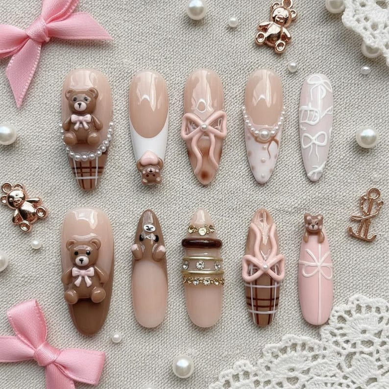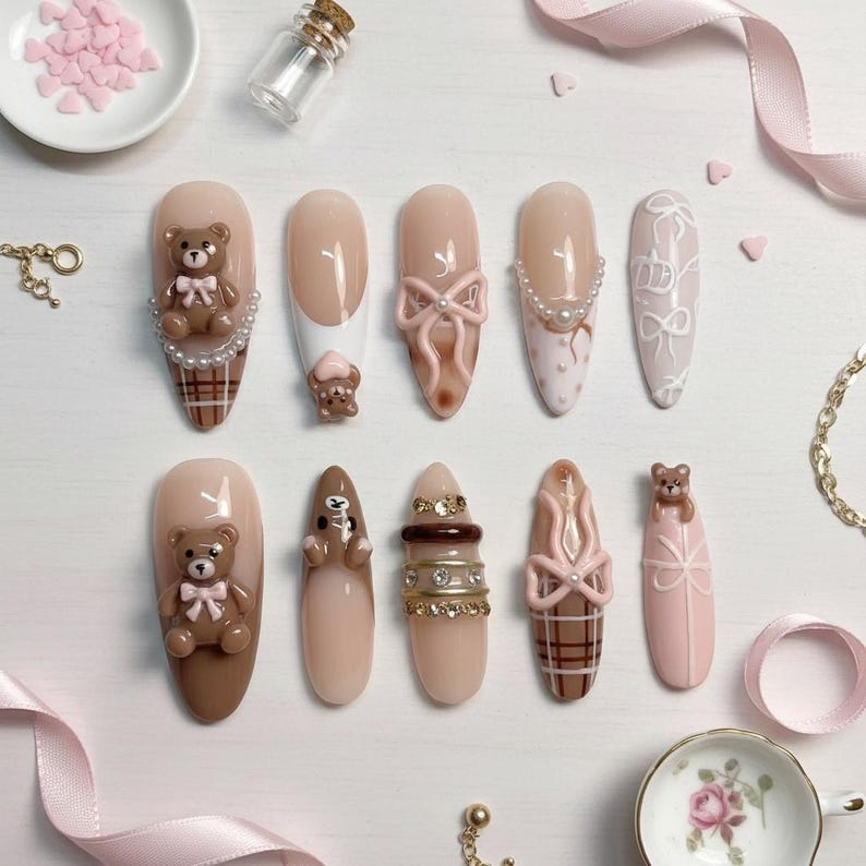 Luxury Brown Teddy Bear Press On Nails: 3D Pink Bow Gingham Reusable Almond Set