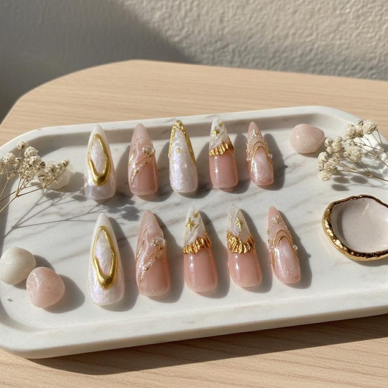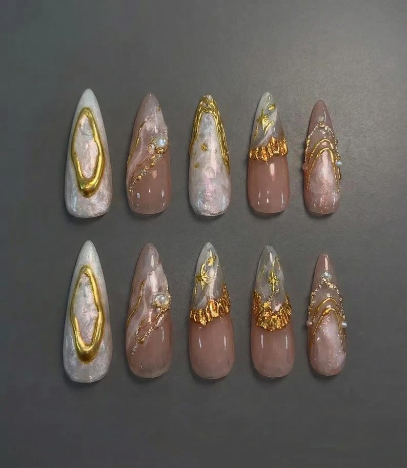 Luxury Celestial Gold Chrome Press On Nails: 3D Star Iridescent Marble Reusable Stiletto Set
