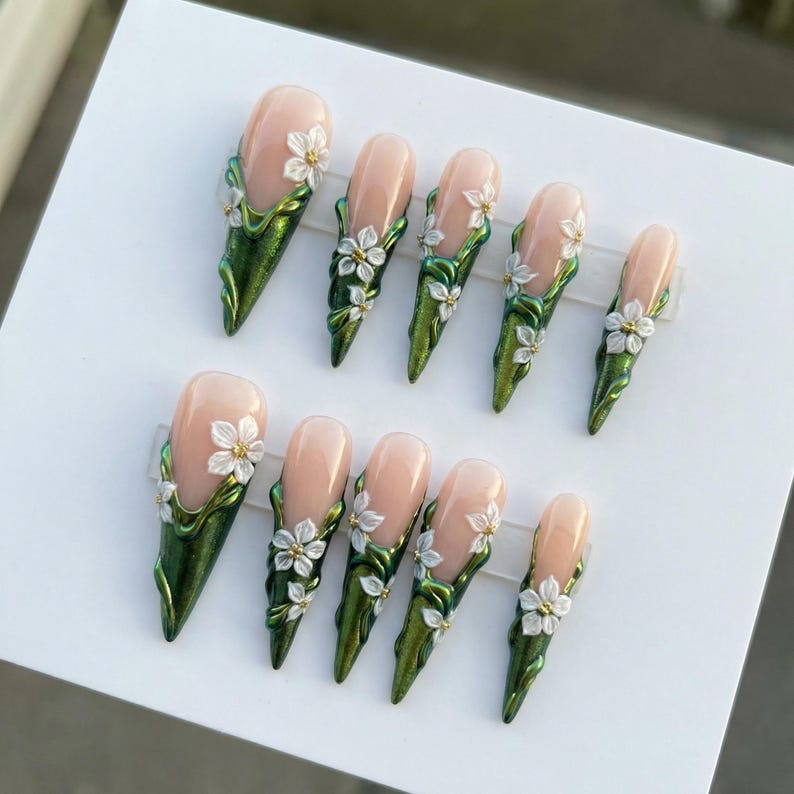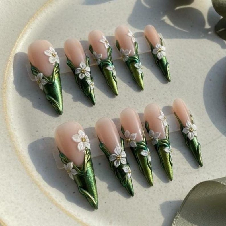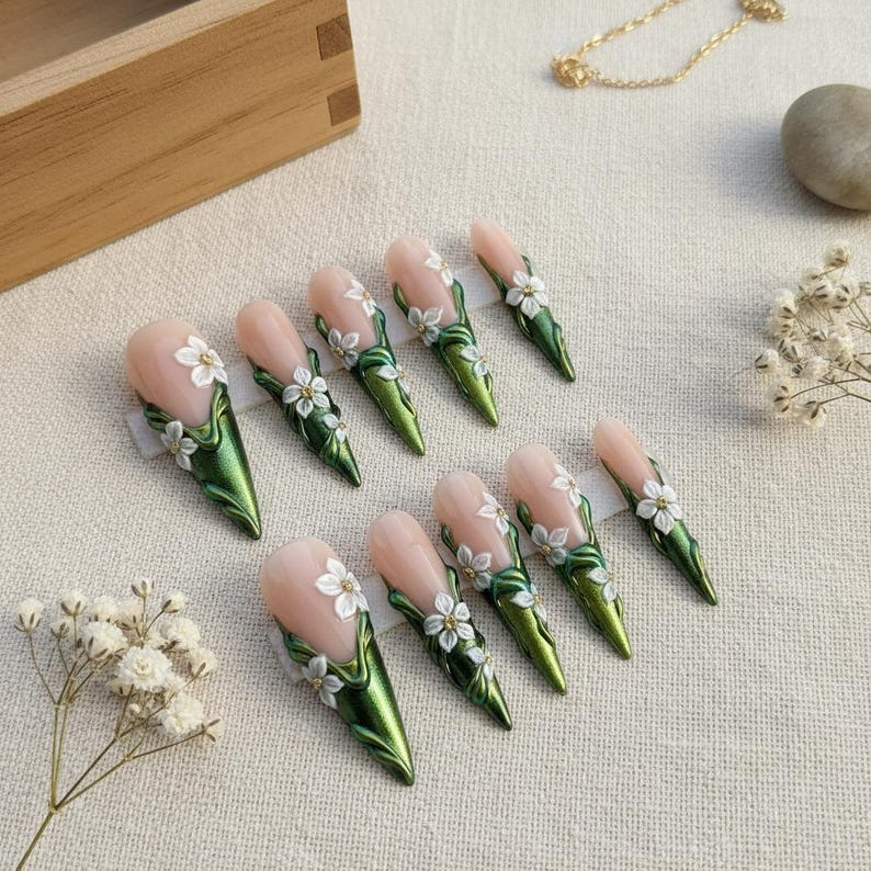 Luxury Green Fairy Forest Press On Nails: 3D White Flower Reusable Stiletto Set
