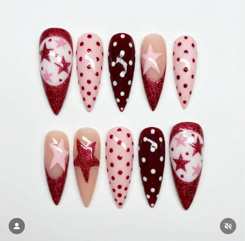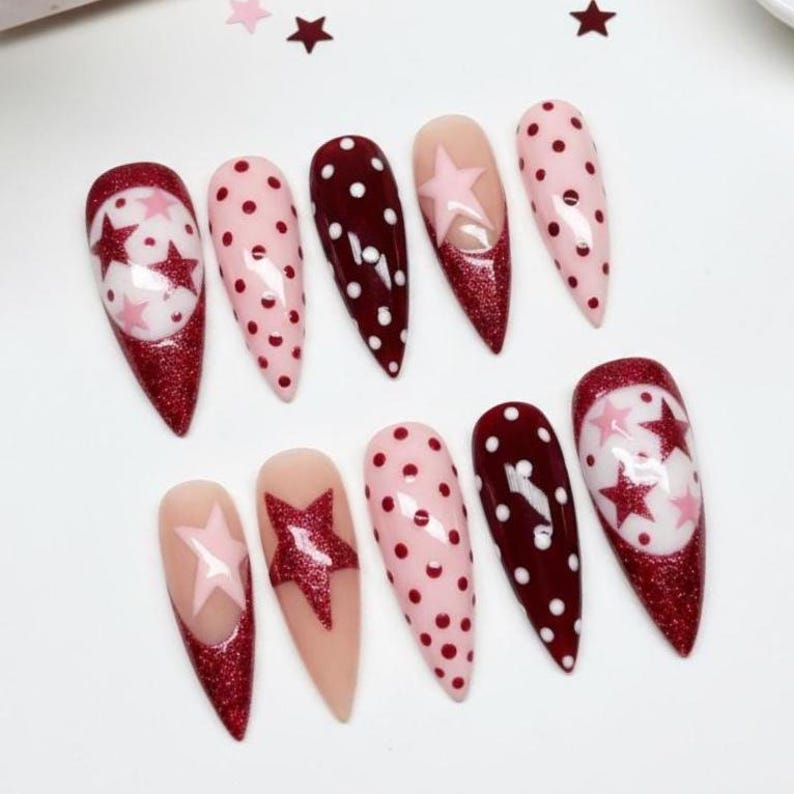 Luxury Red Glitter Star Press On Nails: Burgundy Polka Dot Reusable Stiletto Set