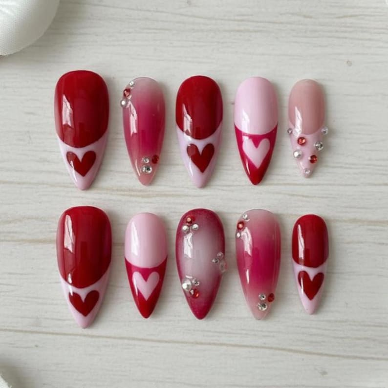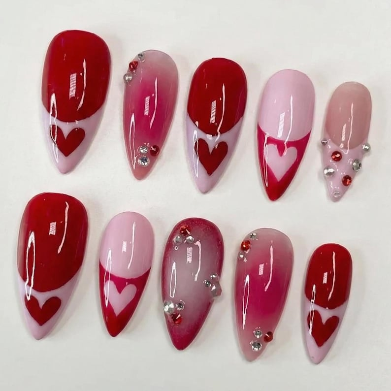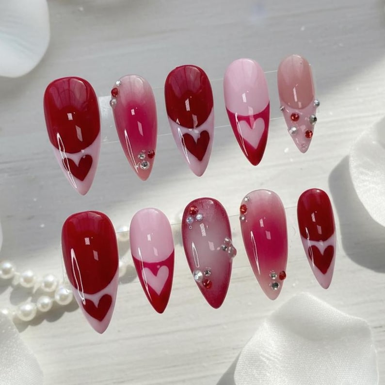 Luxury Red Heart French Press On Nails: Pink Ombre Rhinestone Reusable Almond Set