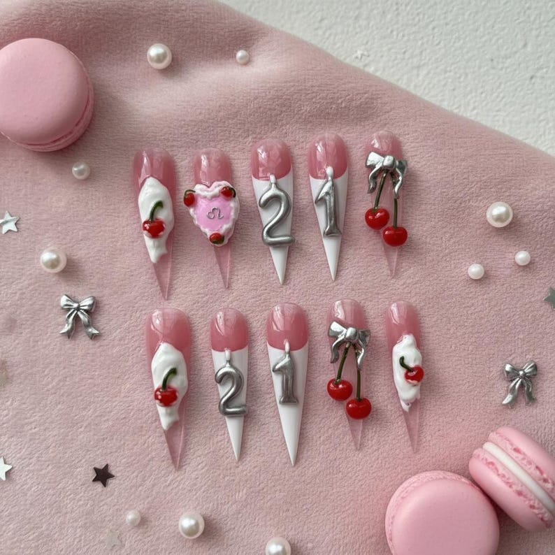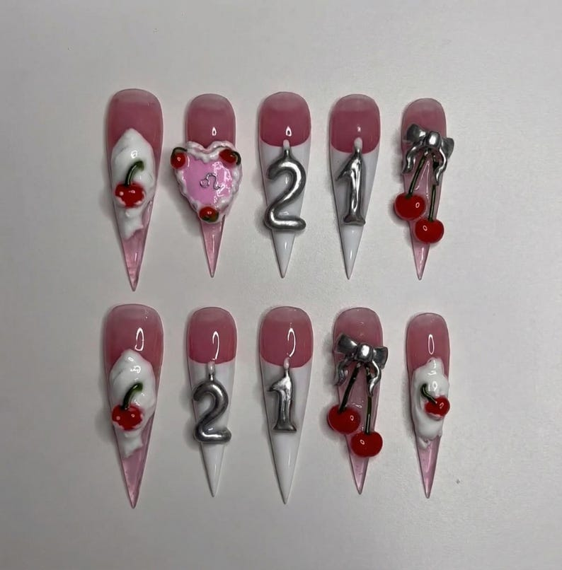 Luxury Birthday Cake Press On Nails: 3D Cherry Silver Custom Number Nail Set