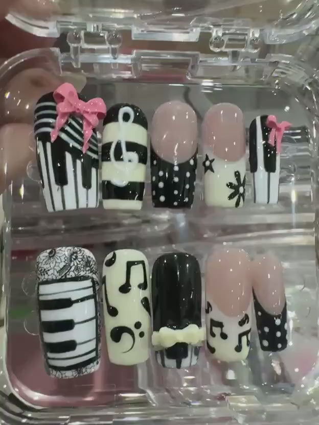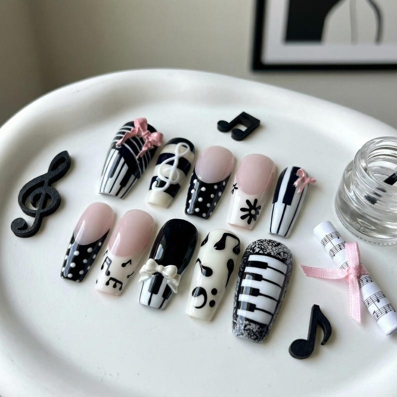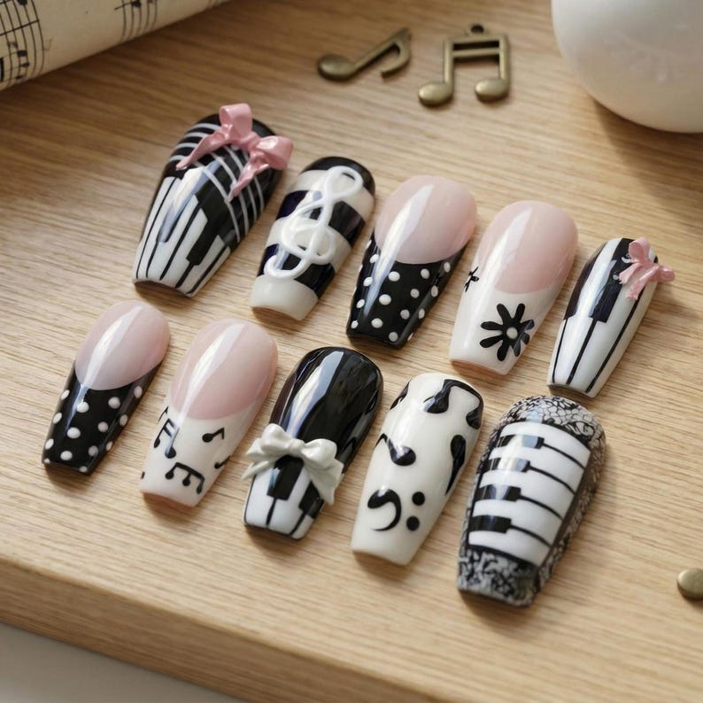 Piano Music Press On Nails: Black White 3d Bow Note & Polka Dot Nail Set