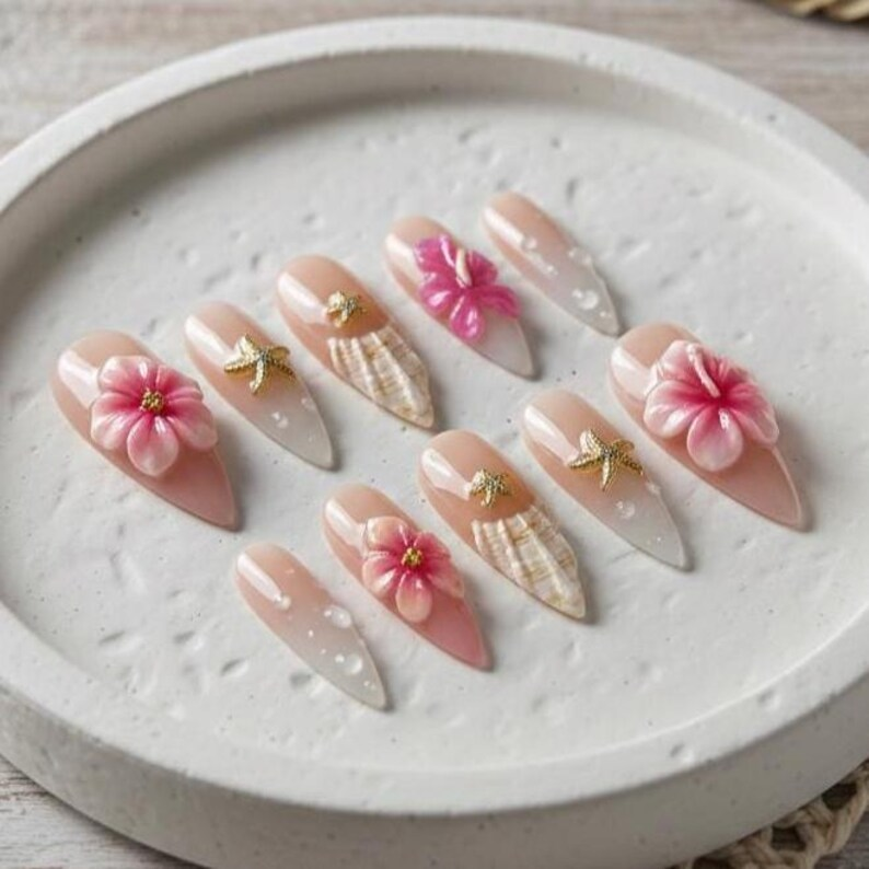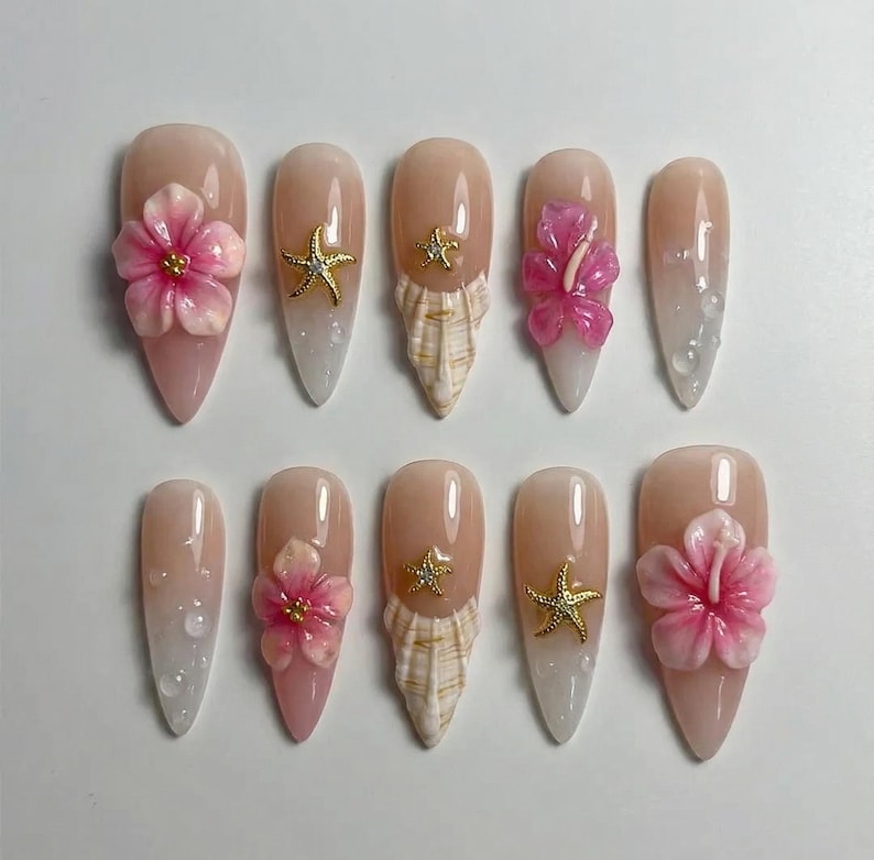 Pink Mermaid Shell Press On Nails: 3D Pearl Floral Gold Beach Vacation Gift
