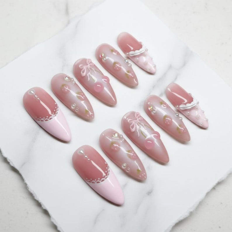 Pink Strawberry Press On Nails: 3D Cherry Bow Unique Sarcastic Gift for Wife Art