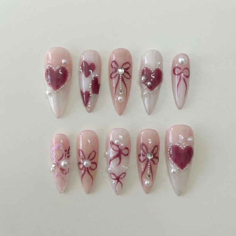Red Coquette Press On Nails: Hand Painted Heart Bow Reusable Pearl Fake Nails