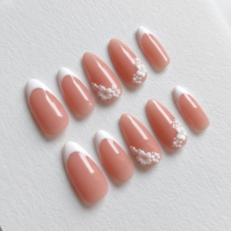 White French Press On Nails: 3D Tiny Flower Unique Elegant Minimalist Bridal Art